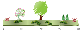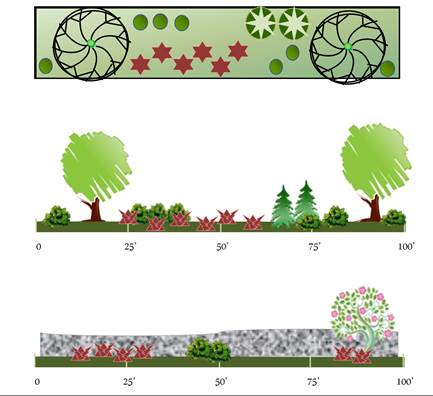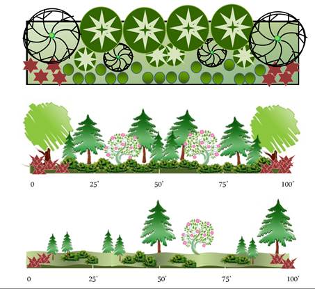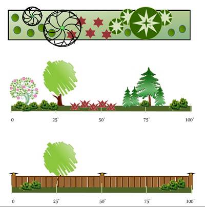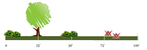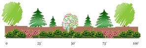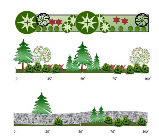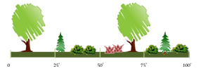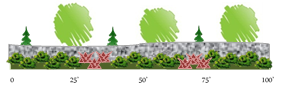 Buffer requirements decrease as the width of the buffer increases.  The minimum number of trees is specified and this can be either any of the trees designated in the Plant Unit Table.  The balance of the Plant Unit must be achieved with shrubs, bushes, perennials, and ornamental grasses.  No annual plants shall be considered for permanent landscaping purposes.