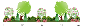Buffer requirements decrease as the width of the buffer increases. The minimum number of trees is specified and this can be either any of the trees designated in the Plant Unit Table. The balance of the Plant Unit must be achieved with shrubs, bushes, perennials, and ornamental grasses. No annual plants shall be considered for permanent landscaping purposes.