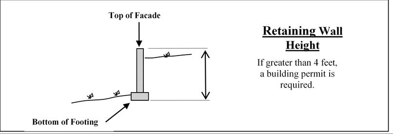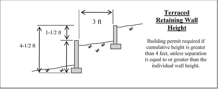 1. In general, permits are not required for retaining walls which are not over 4 feet in height measured from the bottom of the footing to the top of the wall, or for terraced retaining walls that are separated by more than their cumulative height.