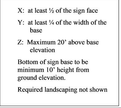 (4)   Elevated Sign:  Any sign placed upon, or supported by, the ground independent of the principal structure on the property where the bottom edge of the sign face is ten feet or more above the ground level, the overall sign height is no more than twenty (20) feet, the supporting structure of the sign is at least half the width of the sign face, and the base height is at least ¼ the width of the base.