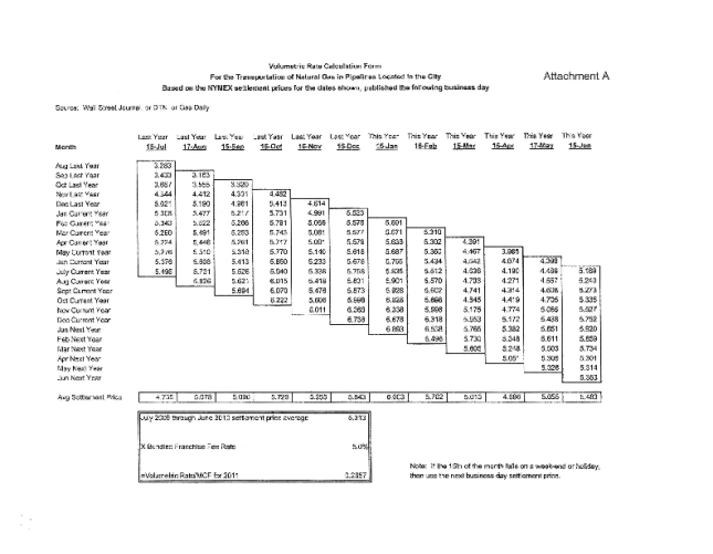 “Volumetric Rate” shall mean $0.2657 per MCF for Transport Gas distributed to Transportation Consumers. The Volumetric Rate shall be subject to adjustment and recalculation in the future in accordance with the provisions set forth below. The Volumetric Rate Calculation form incorporated herein and attached hereto as Attachment A shall be used for recalculating the Volumetric Rate. There shall be an annual recalculation of the Volumetric Rate which shall be effective each January 1. The recalculation shall be based on Settlement Prices for the twelve (12) month period beginning in July of the second (2nd) preceding year and ending in June of the preceding year. For the fifteen (15th) day of each month during said twelve (12) month period, the Settlement Prices for natural gas for the next twelve (12) months will be summed and divided by twelve (12) to determine an average Settlement Price. The average Settlement Prices for each of the twelve (12) months shall then be summed and divided by twelve (12) and multiplied by five percent to obtain the Volumetric Rate to be effective January 1 of the next succeeding year. The Volumetric Rates shall be calculated by the City in accordance with the procedures set out herein and filed with the City Clerk by July 31 of each year for those rates to be effective on January 1 of the following year.