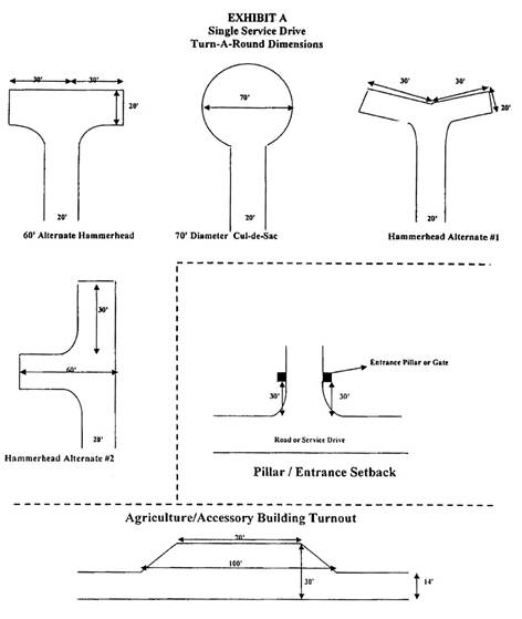 (d) Service Drives over five hundred feet (500’) in length must have an Approved Turnout which is not less than thirty feet (30’) wide and seventy feet (70’) in length for every five hundred feet (500’) in length. The approved turnout must comply with the minimum dimensions and requirements found in Exhibit A.