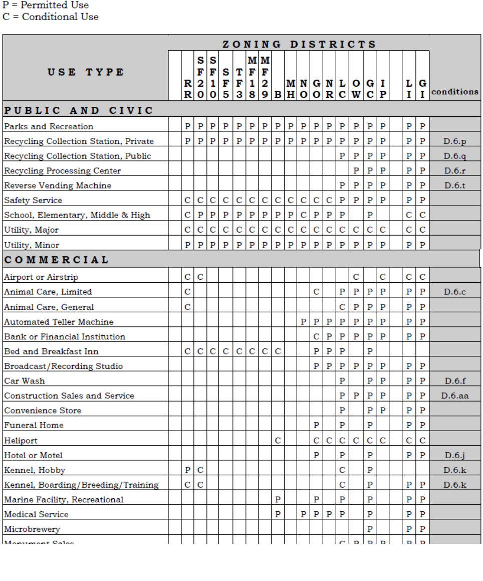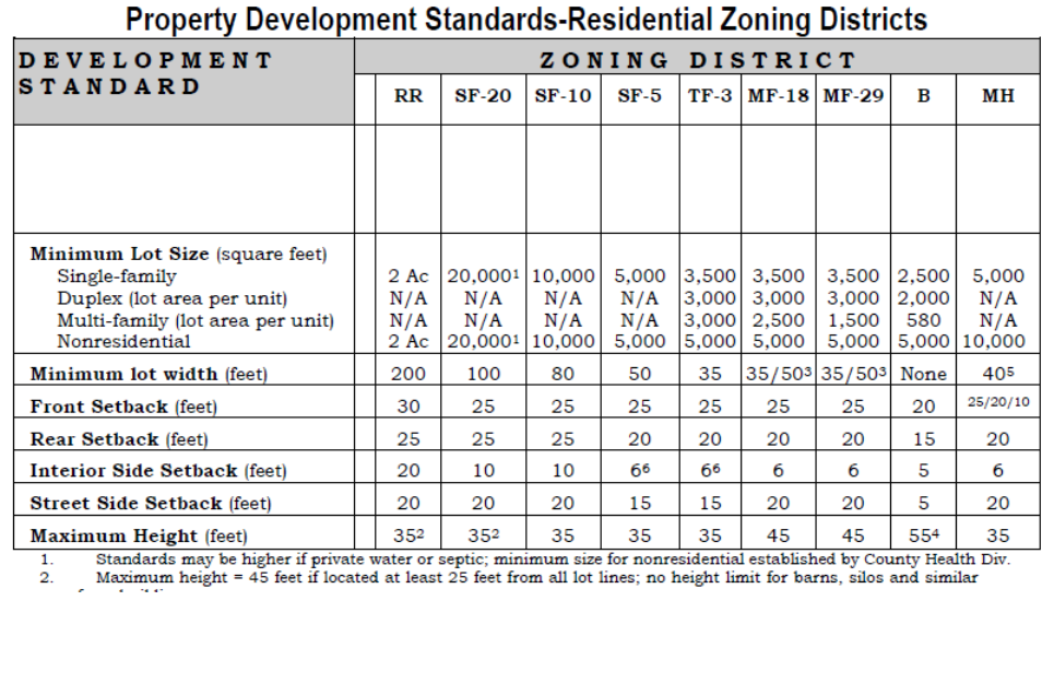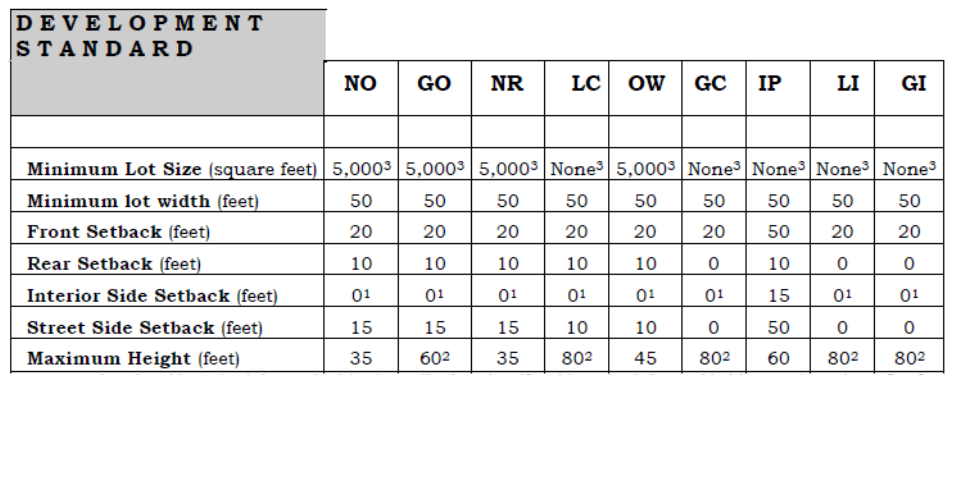 1.    Property development standards schedules.  The following property development standards schedules provide tabular summaries of the dimensional and site development standards applicable within residential and nonresidential zoning districts.  The schedules are intended for reference and do not necessarily reflect all of the regulations that may apply to particular uses or districts.  In the event of conflict between these property development standards schedules and the zoning district standards set out in Secs. III-B and III-C, the standards of Secs. III-B and III-C shall control. The compatibility standards of Sec. IV-C may require greater setbacks or allow lesser heights than specified in either the property development standards schedules or the zoning district standards.  Also, other applicable City development codes may have requirements that take precedence.