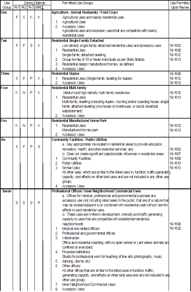 B. Permitted “Use Groups” in each zoning district are shown by means of symbols in Section 18-609